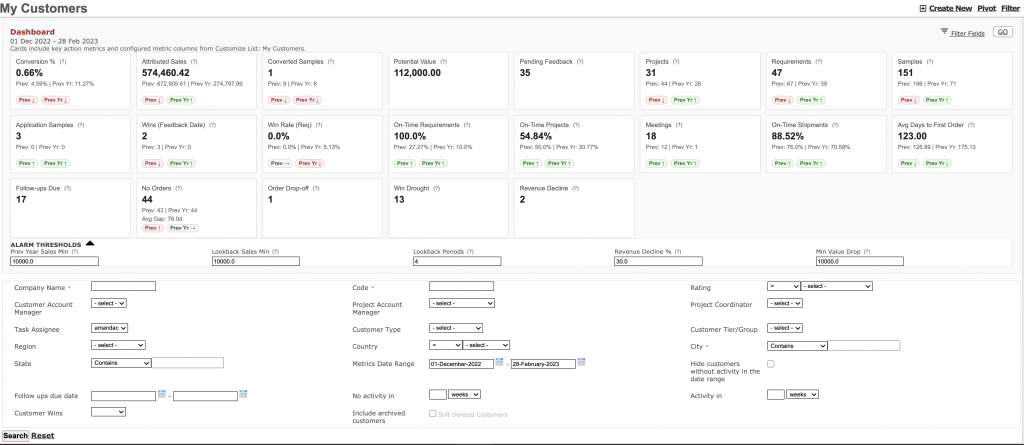 A drag‑and‑drop analytics table to slice metrics by time, manager, region, etc. Percent/ratio metrics use weighted aggregation (sum numerators / sum denominators), so grand totals are weighted ratios, not simple averages. Pivot metrics include Win Rate (Req), % On Time Projects, % On Time Requirements, % On Time Shipments, Attributed Sales, Converted Samples, Conversion %, Avg Days to First Order (permission-based)